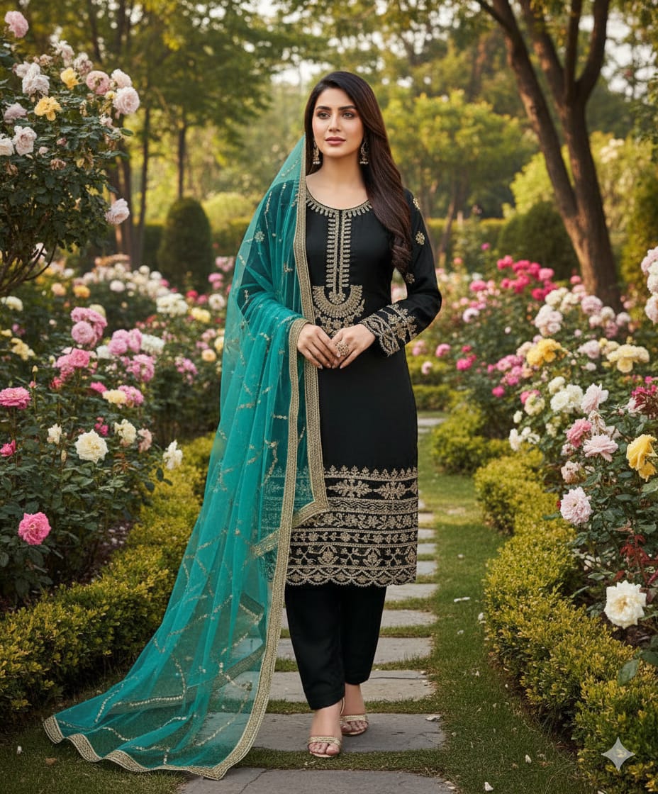 Katan Silk Adda & Beads Work Embroidery 3Pc Dress